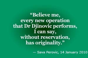 However, in early 2003 Dr Djinovic traded his plans to move to the United States (and his “Green Card”) in exchange for the priceless opportunity of a lifetime — personal hands-on surgery training in the very latest and most advanced surgical procedures and surgical techniques by Professor Sava V Perovic, the best surgeon in Serbia's history and the man widely recognized by experts as the leading urological surgeon of our time.